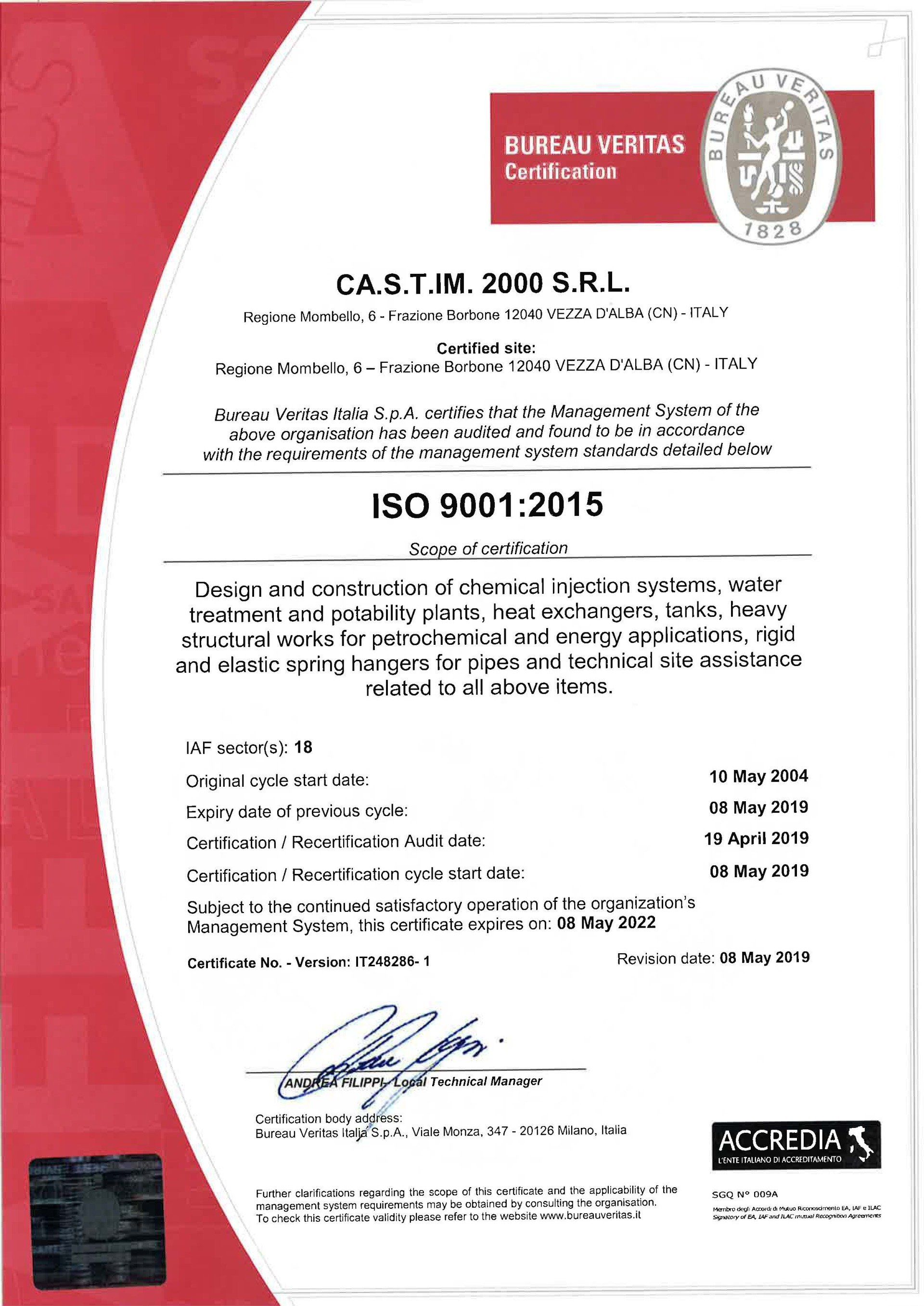 Our Company is certified in accordance with the American standard ASME U-Stamp, Cert. N. 39590, UNI EN ISO 9001: 2015, Cert. N. IT248286 requirements, for all company divisions: chemical injection system design and construction, water treatment and purification, heat exchangers, tanks, heavy fabrication for the petrochemical and energy industries, rigid and elastic supports for pipes, with relevant after-sales assistance.